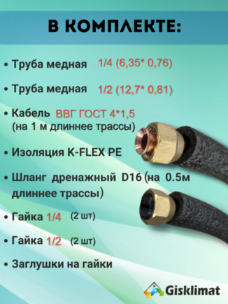 Готовый комплект 1/4 и 1/2 с кабелем ВВГ ГОСТ 4х1.5 - идеальное решение для монтажа кондиционера с инверторным типом работы компрессора. В категории аксессуаров и запчастей для кондиционеров этот набор выделяется своей универсальностью и качеством. Независимо от бренда вашего устройства, этот комплект подойдет для абсолютного большинства моделей.